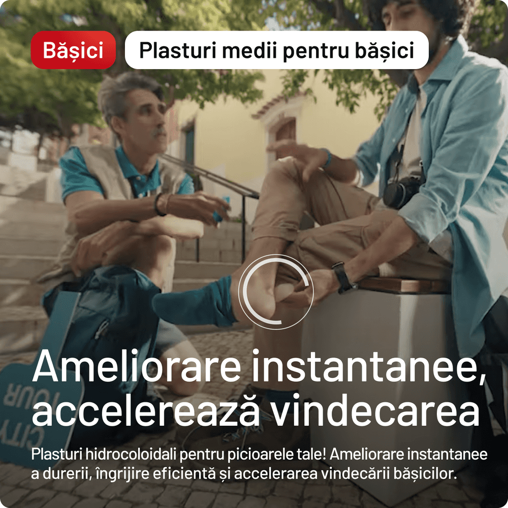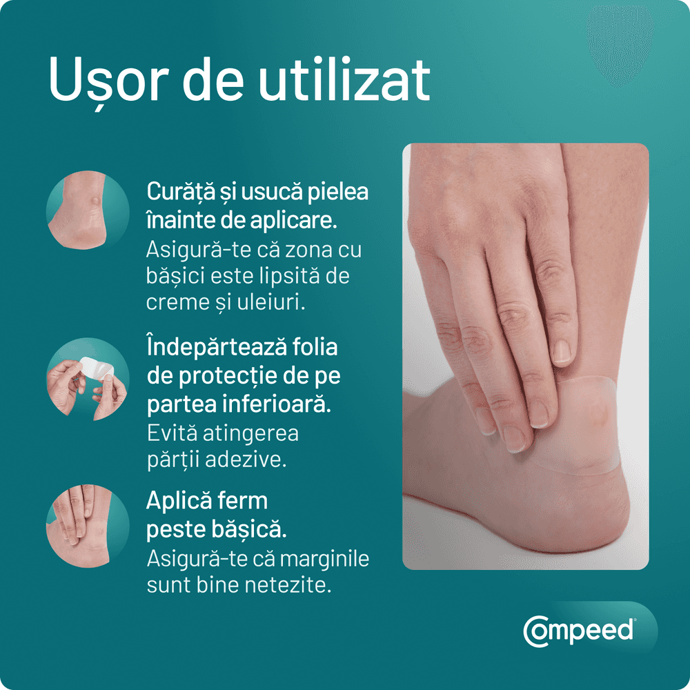 Pantofii incomozi pot duce la apariția bășicilor — folosește plasturii Compeed® pentru protecție eficientă împotriva frecării. Poți preveni apariția bășicilor și purtând două perechi de șosete subțiri când faci mișcare. Citește ghidul nostru complet de prevenție!